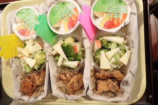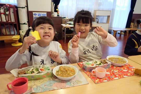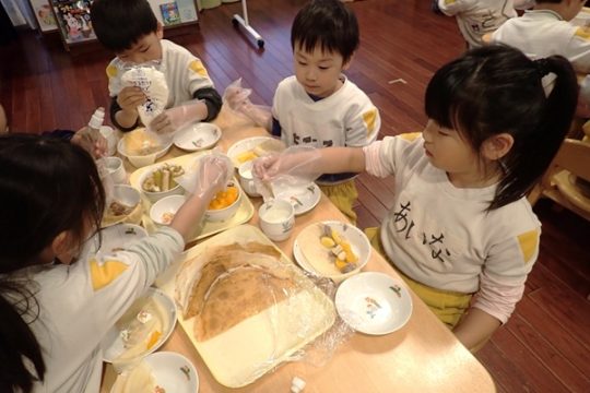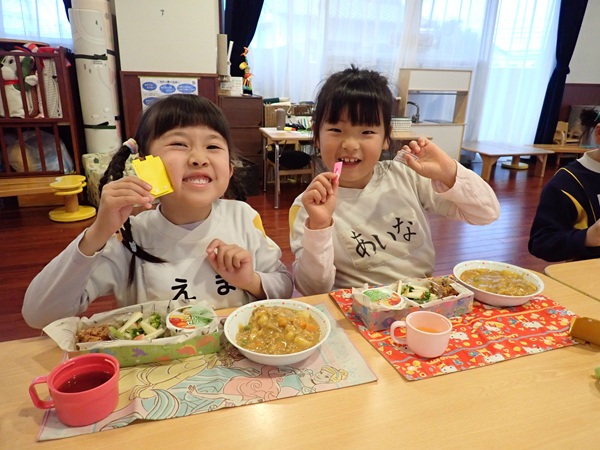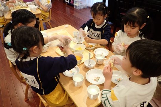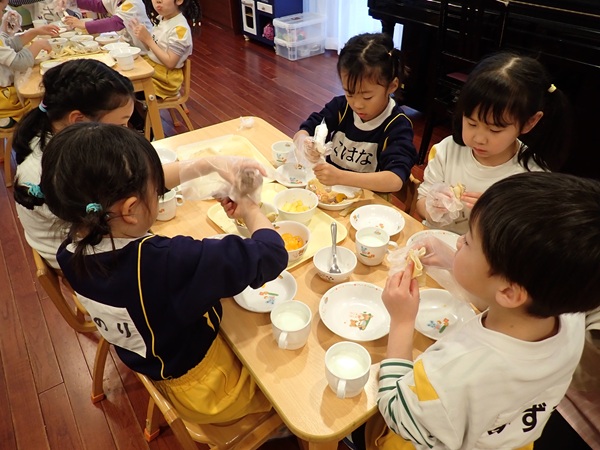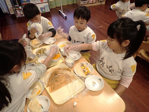 お別れ会のあとは、年長児さんが楽しみにしていたリクエスト給食で、とっても素敵な盛り付けにみんな大喜びでした。手作りのランドセルに入ったメッセージカードもあり、嬉しそうに食べている姿が可愛かったです。おやつはクレープを手作りし思い出いっぱいの1日となり、大満足な様子の子ども達でした。