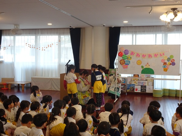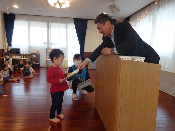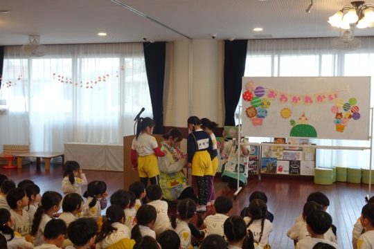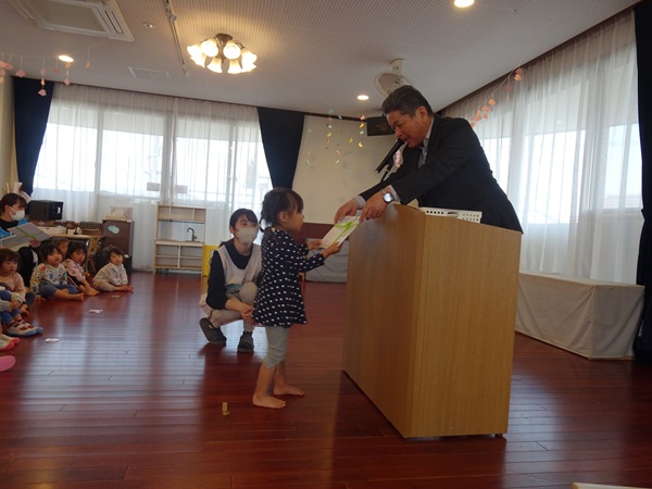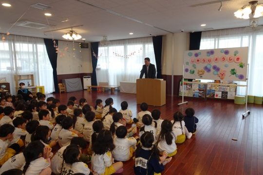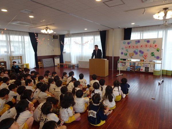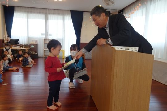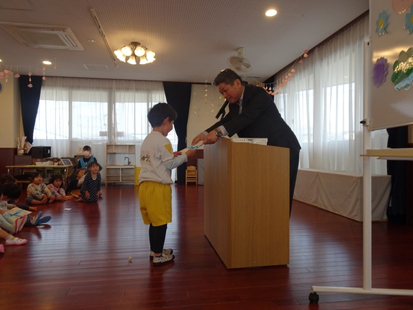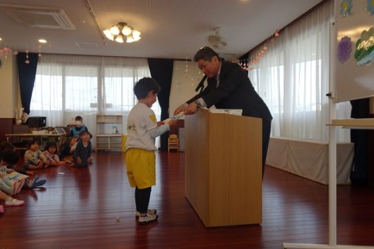 3月30日(月)に2歳児~4歳児の子ども達が参加して、修了式が行われました。代表のお友達が園長先生より修了証書を受け取りました。しっかりと座って園長先生のお話を聞く姿にうれしくなりました。新年度も元気いっぱい色々なことにチャレンジしようね。