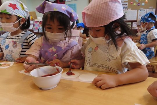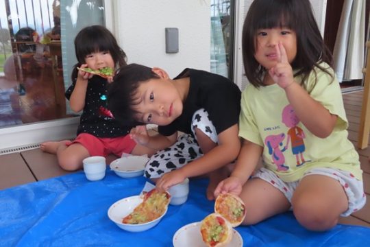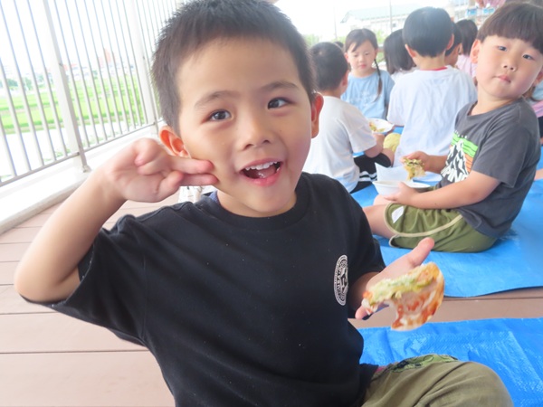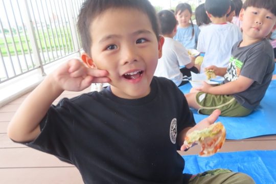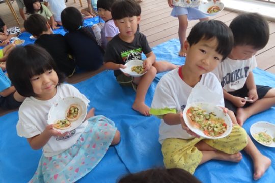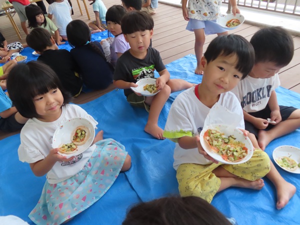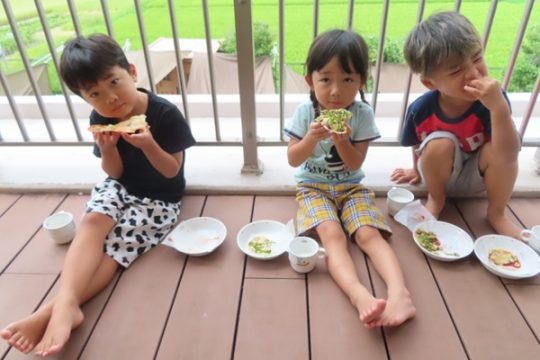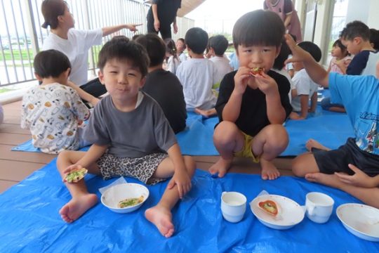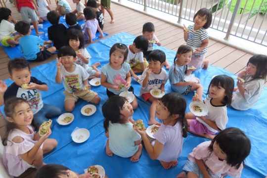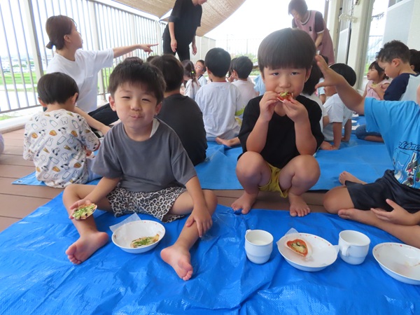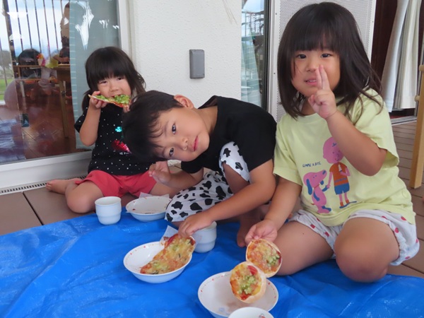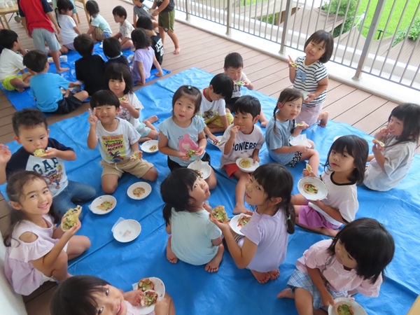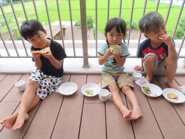 おやつの時間に、テラスでピクニック気分で食べました。いつもは野菜が苦手な子も、「こうやって食べたらおいしい」とぱくぱくたくさん食べた子どもたちです。
