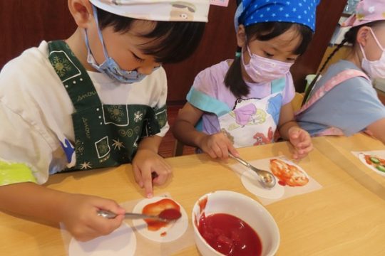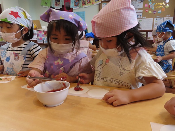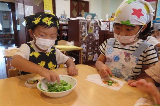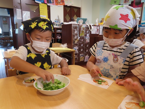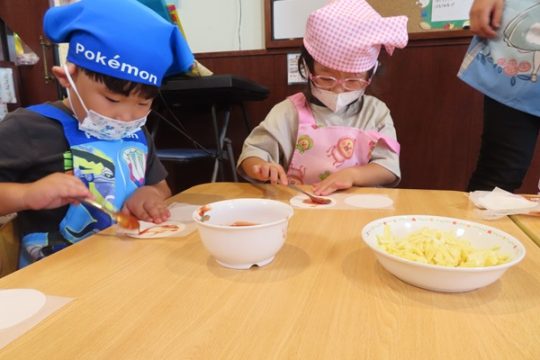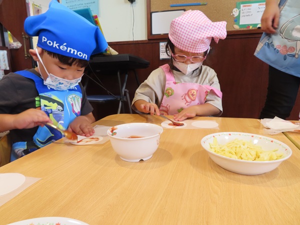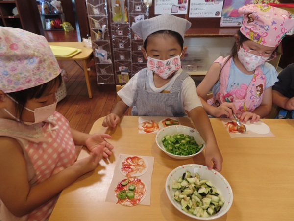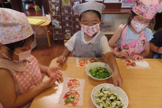 たくさん実った野菜でなにかできないかと先生と子どもたちが一緒に考え、「ピザクッキング」を計画しました。米粉の餃子の皮にケッチャップをぬり、みんなで育てた野菜とチーズをたっぷりのせて焼いたら完成です。