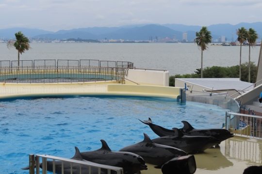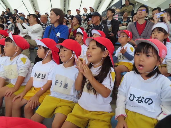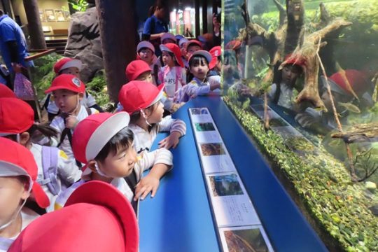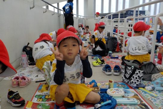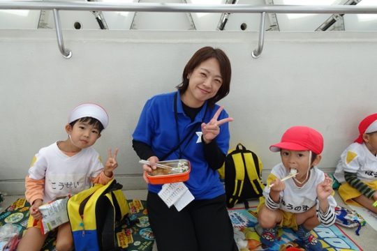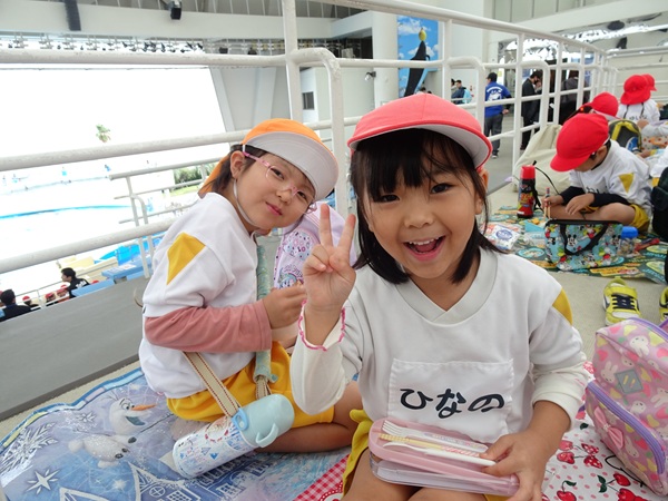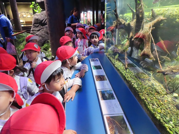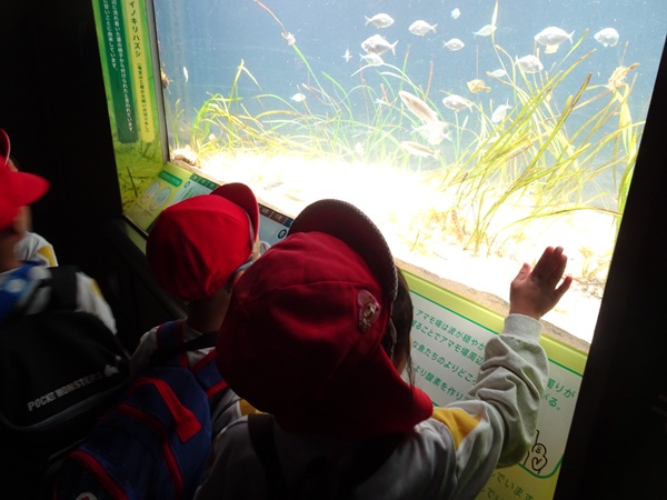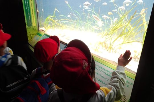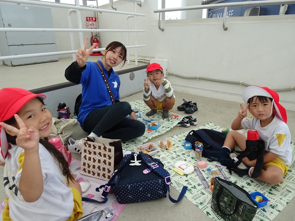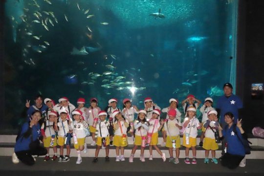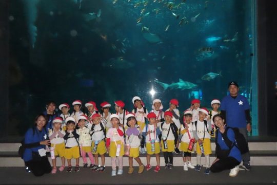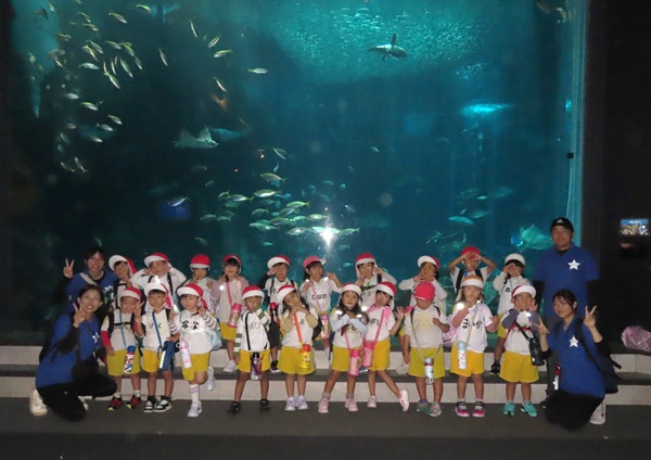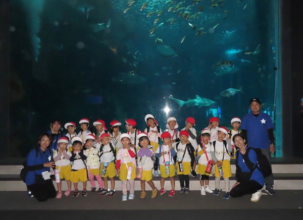 大型バスに乗って、ますます元気になった子どもたち。マリンワールドでは、イルカのショーを見たり、館内を歩いてたくさんの魚などの生き物を観察しました。多くのお客さんがいたのですが、端っこを歩いたり、順番を待ったり、公共のマナーも守りながら楽しむことができました。