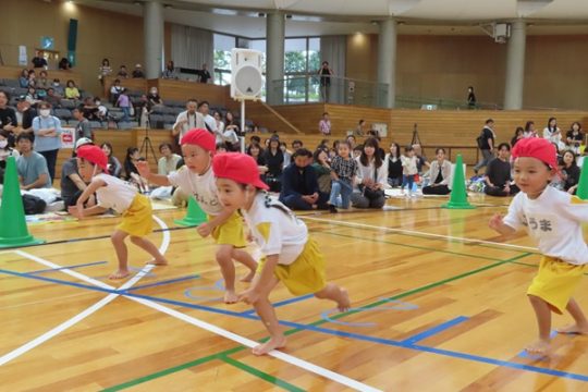 そこで、本年度の運動会ではそれぞれの学年の子どもたちが安心して、主体的に活動できますように、「0.1.2歳児」と「3.4.5歳児」に分かれて、2部制で行うように変更しました。