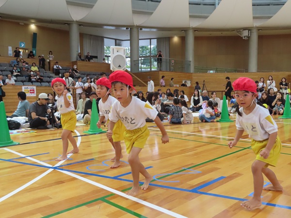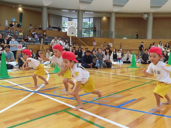 そこで、本年度の運動会ではそれぞれの学年の子どもたちが安心して、主体的に活動できますように、「0.1.2歳児」と「3.4.5歳児」に分かれて、2部制で行うように変更しました。