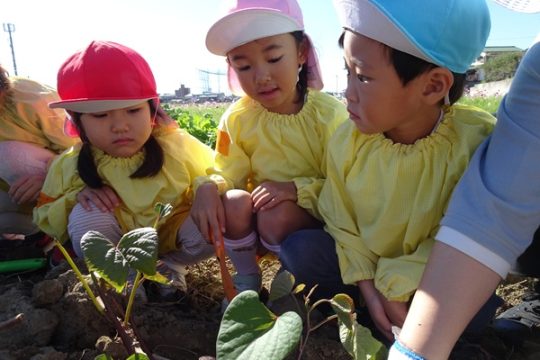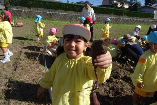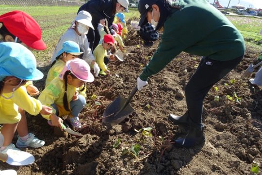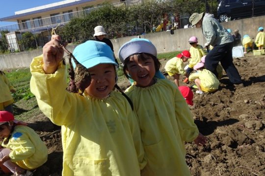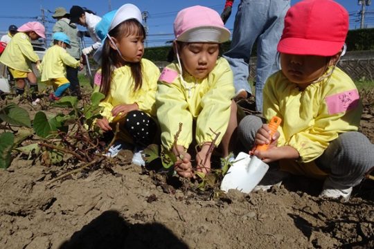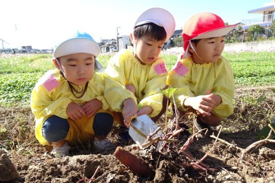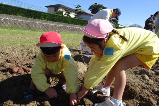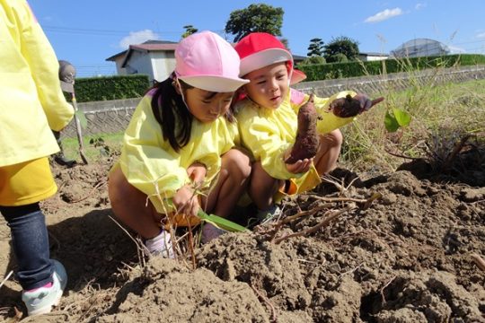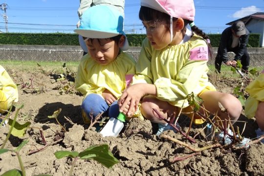 保育園の横の畑に、春に植えたサツマイモの苗が見事に育ち、芋ほりの季節となりました。子どもたちは、畑を眺めながら「おいしいおいもができているかな」「おおきなおいもがほれるかな」と楽しみにしていました。