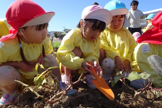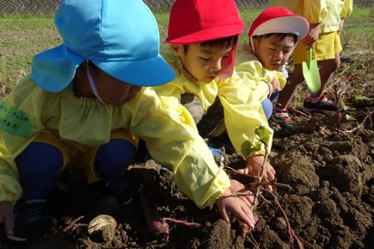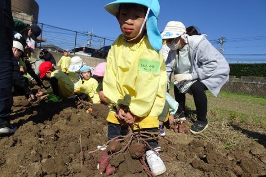 芋の苗植えを3.4.5歳児の縦割りグループで行ったため、同様に芋ほりも同じ3.4.5歳児の縦割りグループで行いました。5歳児のお兄さん、お姉さんが、手をつないで畑まで連れて行ってくれ、一緒に芋ほりに挑戦しました。今年は焼き芋に丁度良い小ぶりなお芋が沢山収穫できました。焼き芋が楽しみですね。