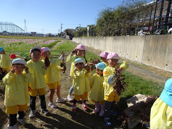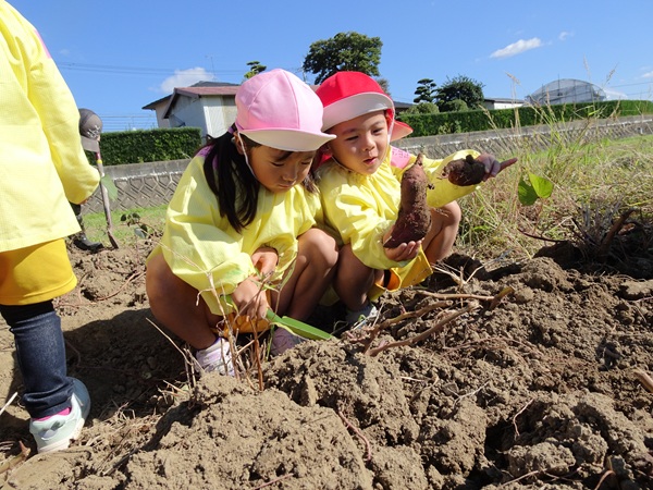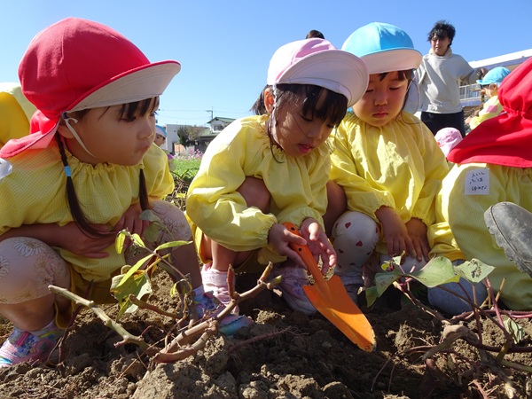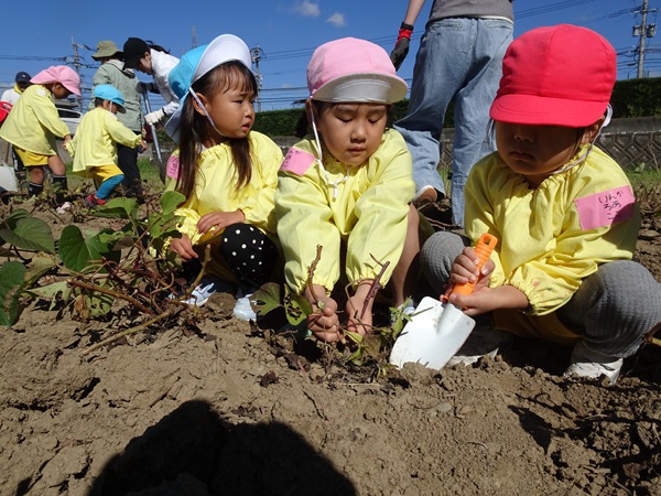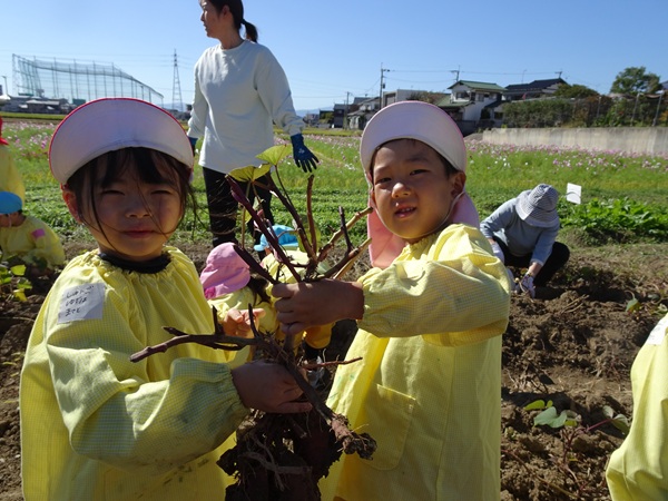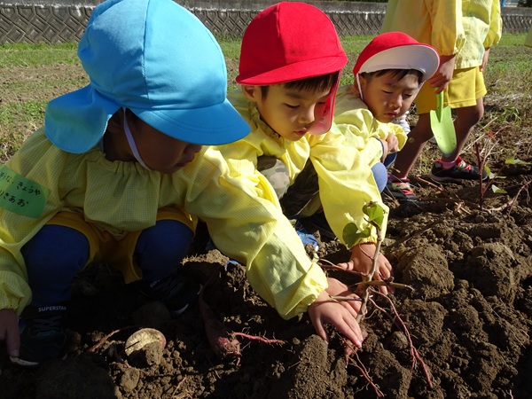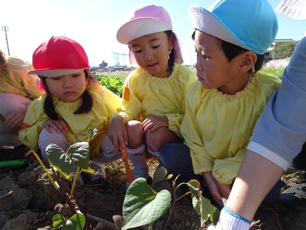 保育園の横の畑に、春に植えたサツマイモの苗が見事に育ち、芋ほりの季節となりました。子どもたちは、畑を眺めながら「おいしいおいもができているかな」「おおきなおいもがほれるかな」と楽しみにしていました。