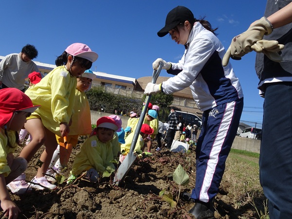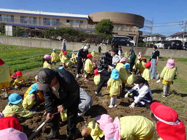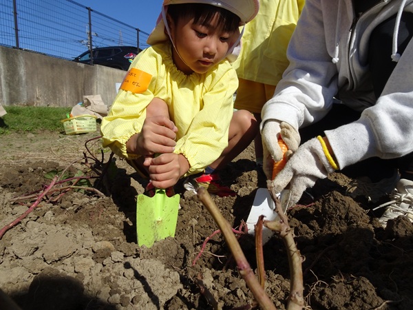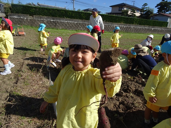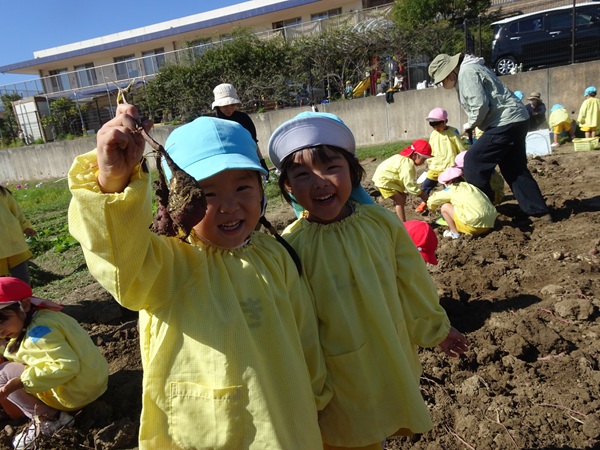 芋の苗植えを3.4.5歳児の縦割りグループで行ったため、同様に芋ほりも同じ3.4.5歳児の縦割りグループで行いました。5歳児のお兄さん、お姉さんが、手をつないで畑まで連れて行ってくれ、一緒に芋ほりに挑戦しました。今年は焼き芋に丁度良い小ぶりなお芋が沢山収穫できました。焼き芋が楽しみですね。