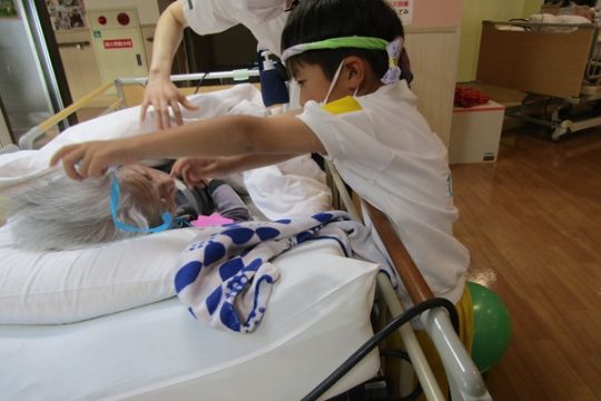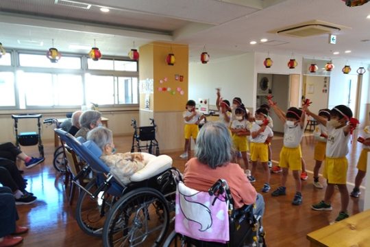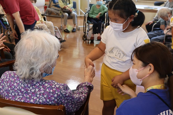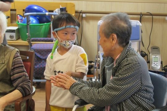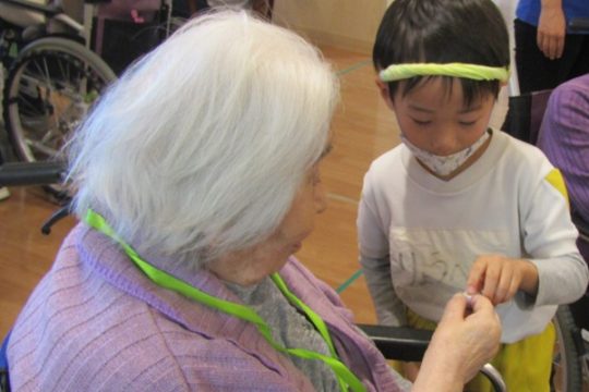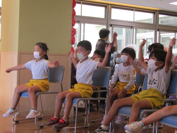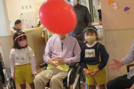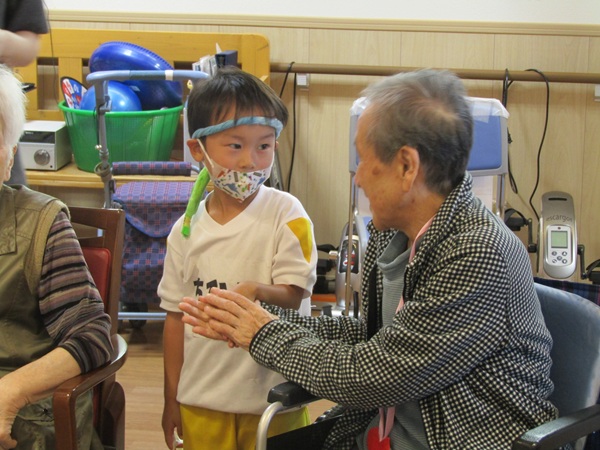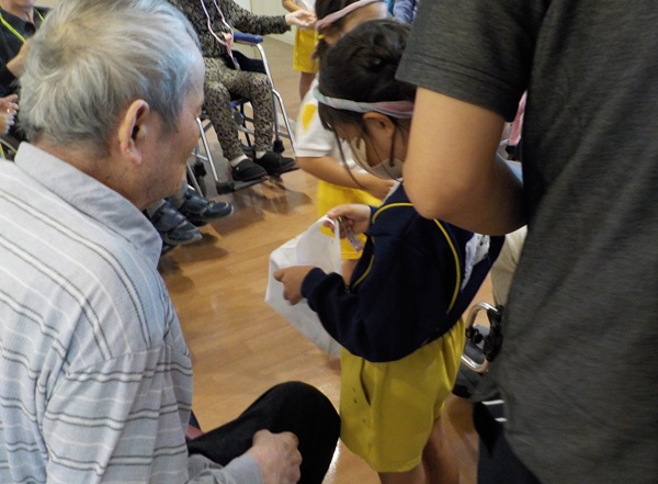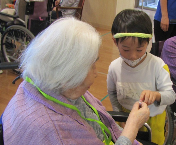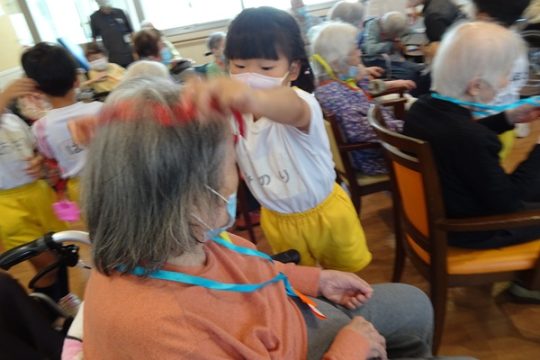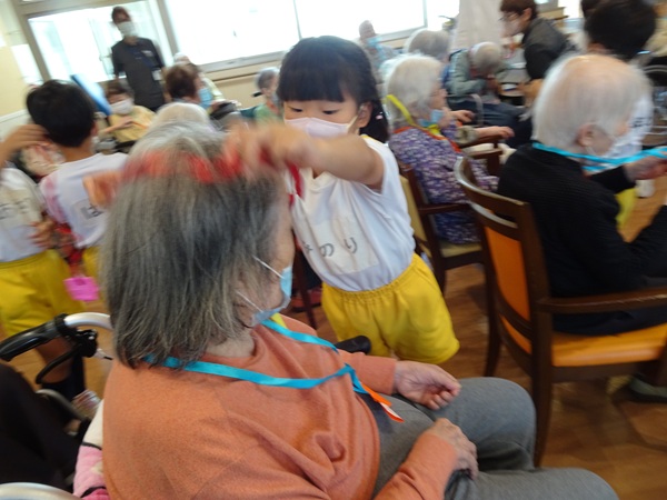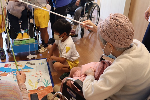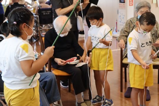 その後は、風船ゲームや魚釣りゲームなど色々な事をして一緒に遊びました。緊張している子もいましたが、少しずつ緊張も溶け、おばあちゃんやおじいちゃん達と一緒にゲームができて楽しそうでした。