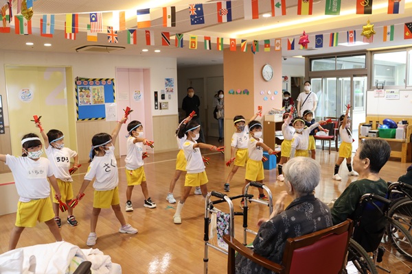 よさこいをおじいちゃん・おばあちゃん達に元気いっぱいに披露してくれました。青洲の里の皆さんも「すごいね」と感動してくれました。